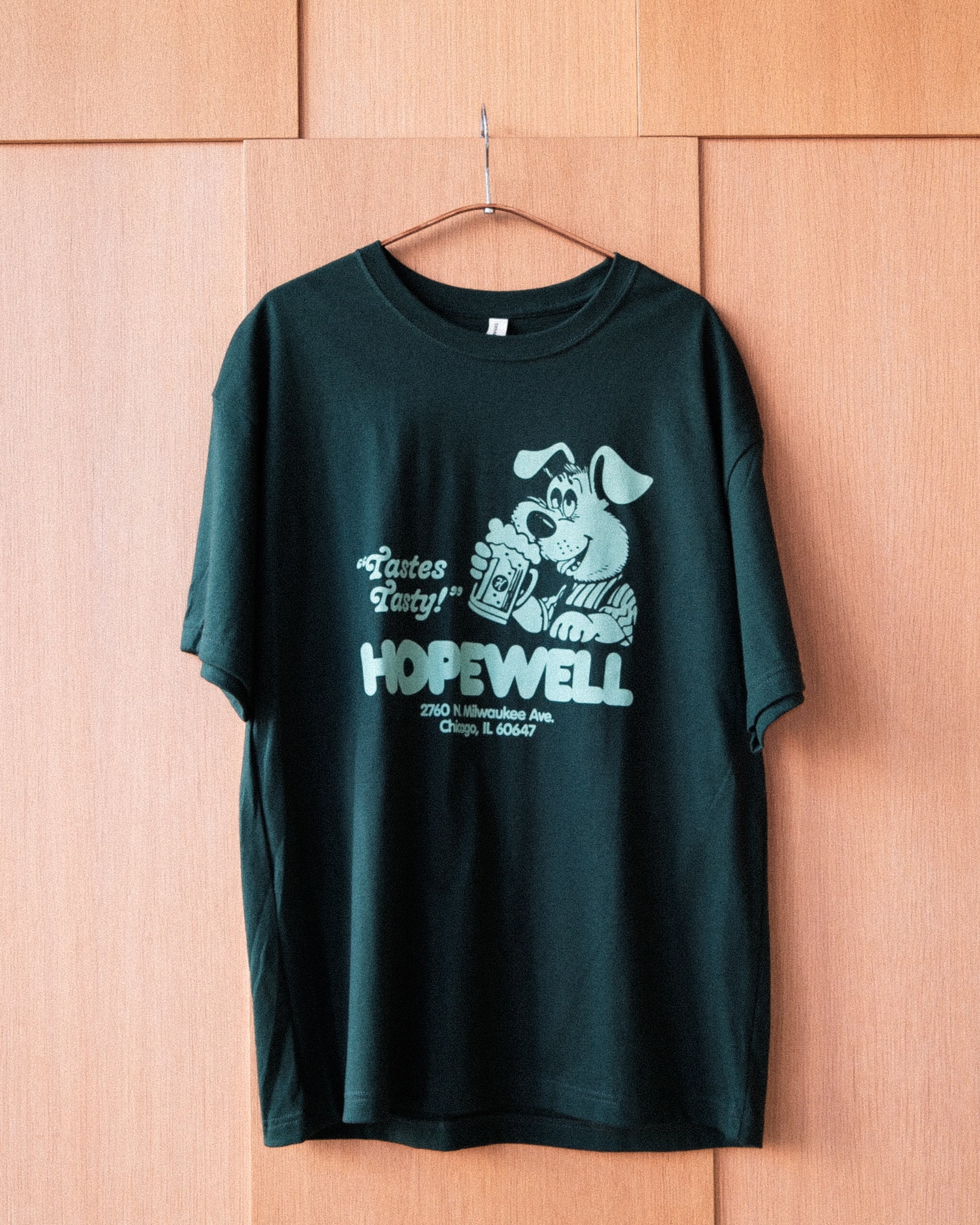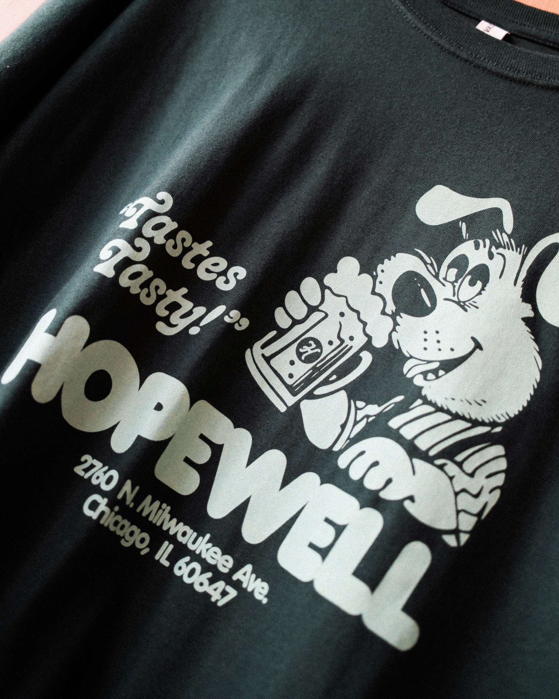 "Tastes Tasty!" t-shirt in forest green with seafoam imprint.